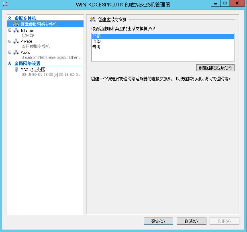 外部虚拟交换机,连接类型选择外部网络,选择一个插上网线的并且能连接外部网络的网卡,点击确定。