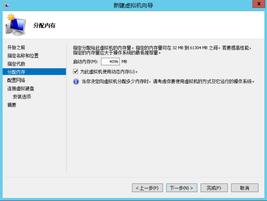 启动虚拟内存,并且可以勾选为此虚拟机使用动态内存,这个选项绝对是Hyper-V的一大亮点,动态内存能更好更合理的分配虚拟机的内存,这相比于传统的虚拟机而言,极限的提升了虚拟机内存的使用率,杜绝了闲置内存在虚拟机上面的开销浪费。不过此处需要注意的是,这个地方设置的启动内存是虚拟机开机的时候Hyper-V会分配给虚拟机的内存,开机内存设置的太大,即使用了动态内存,会有可能在同时开启多台虚拟机的时候将物理主机的内存爆掉,所以这个地方需要考量开启虚拟机时的物理内存多少。