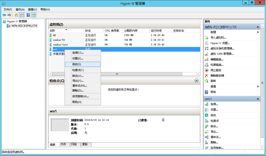 右键->启动,也可以连接连接,然后通过虚拟机连接中的启动按钮启动。